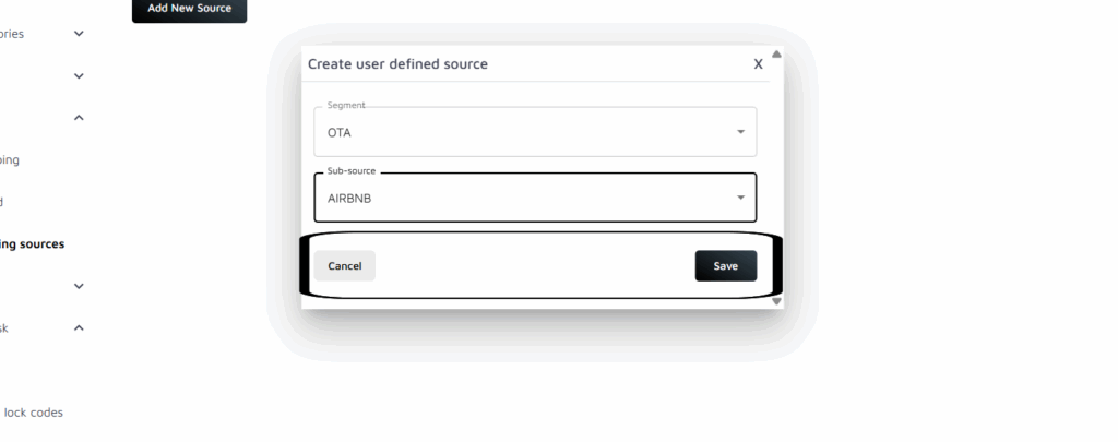 - On the Custom Booking Sources page, click on Add New Source. This will open a pop-up form for adding a new source.