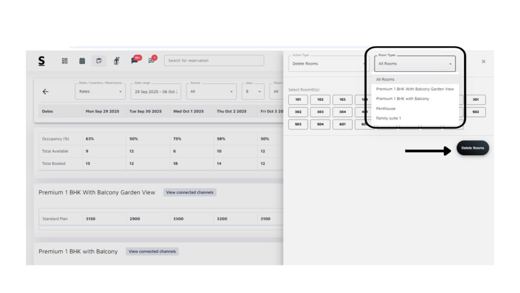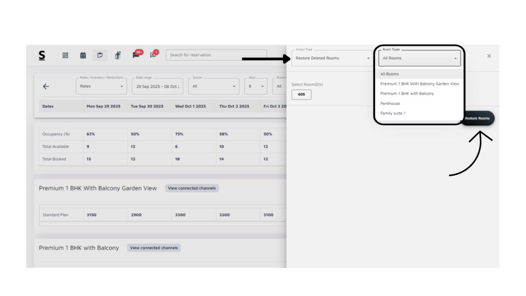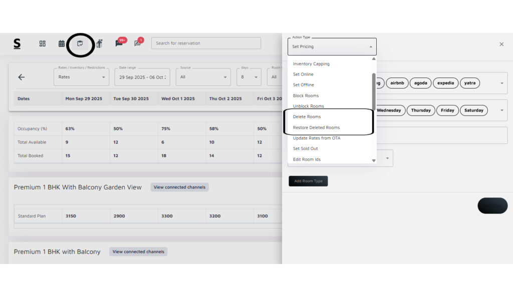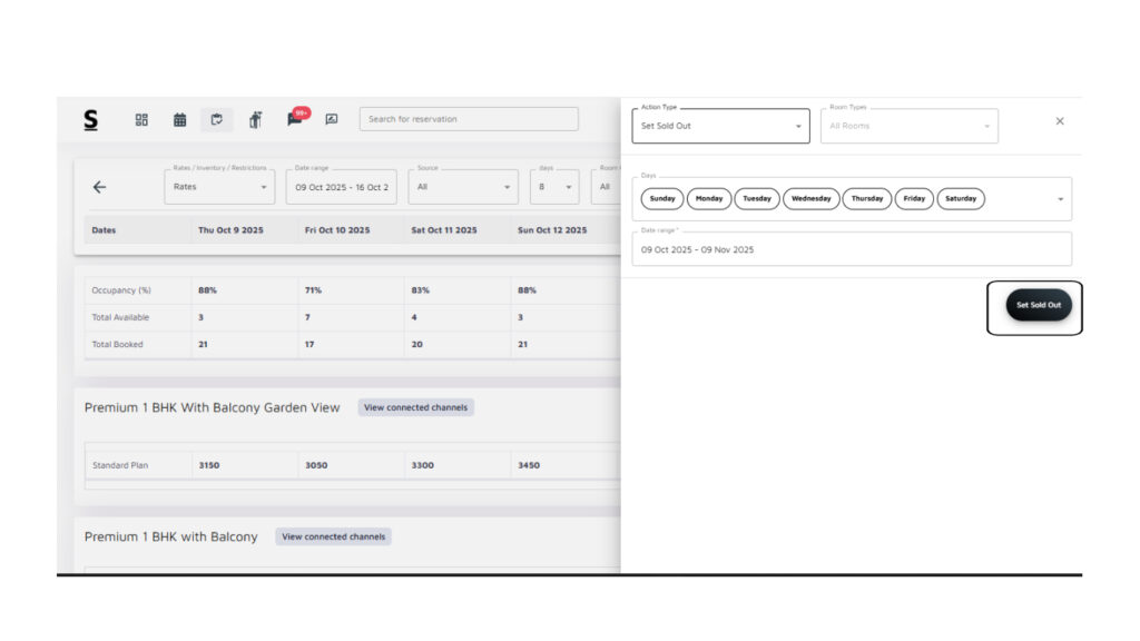 On the right side of the screen, you will find the “Availability Today“. This box provides a quick view of room availability for the current day, including details on room types and base prices. It allows you to quickly respond to guest inquiries regarding room availability.