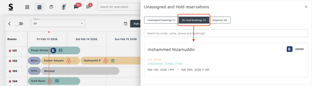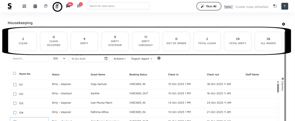 Search Bar: Located directly below the Tiles, the search bar allows you to quickly find specific bookings to organize better and manage reservations. Simply type in a guest name, phone number or stayflexi booking number starting with SFBOOKING_XXXXX_54321 or last 5 digit unique number i.e 54321, to instantly locate the reservation you’re looking for. This search bar makes it effortless to manage a large volume of bookings and find specific booking details at a moment’s notice.