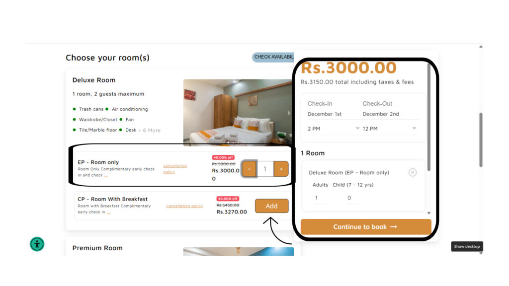 - Click Add to confirm your selection. The selected room and rate plan will appear in your booking summary on the right.