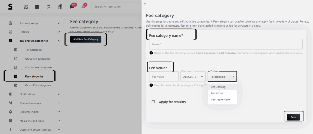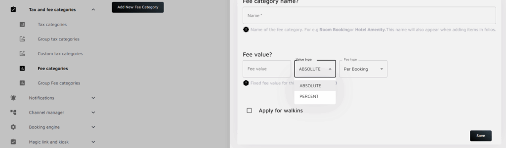Fee categories: A Fee category can be used to calculate and apply fees in a variety of places. For example, defining fee for a room type, fee for an item being added to an invoice, or fee for products in a shop.