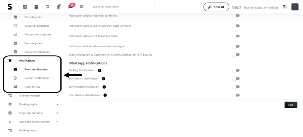 Under the Notifications category, you can configure automated communication settings for both guests and hotel staff: