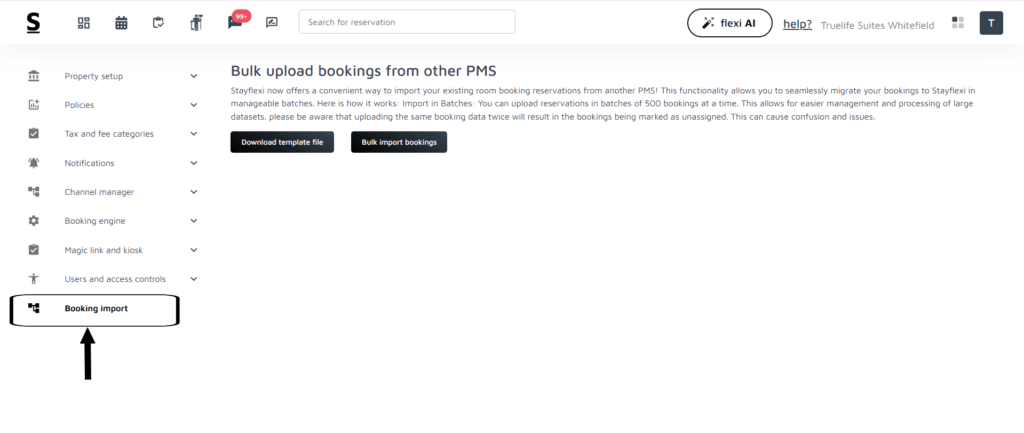 The Booking Import section allows you to seamlessly upload and sync past or existing reservations into Stayflexi.
