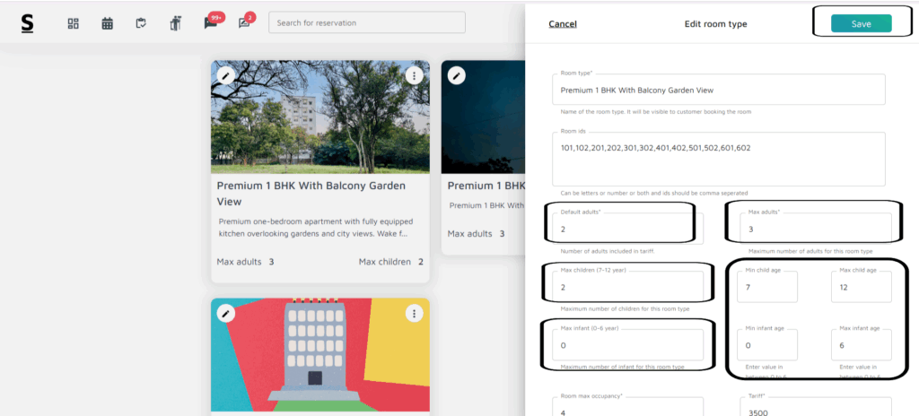 Setting Room Occupancy: How do I define maximum occupancy, including adults, children, and infants, along with age limits for rooms?