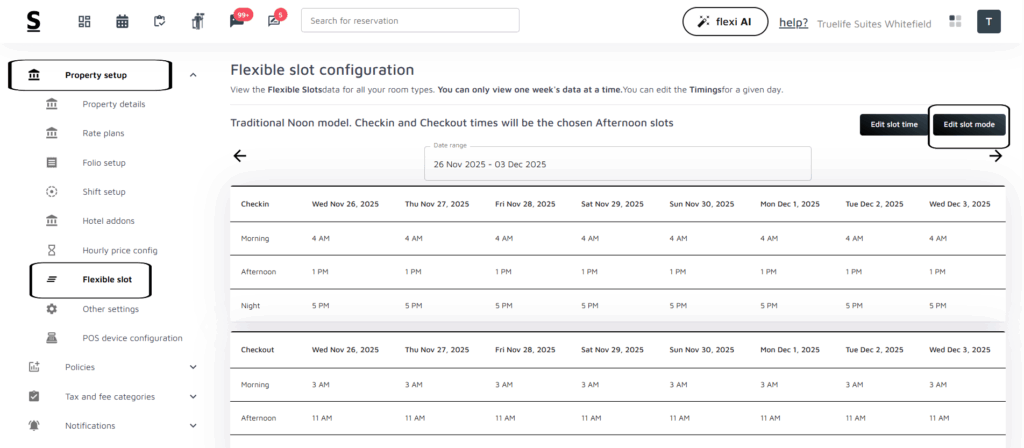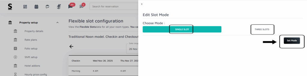 - Definition: A “Single Slot” refers to fix check-in and check-out time a property can be booked. For example, if you select a single slot for a property, it might represent a booking window such as 12 PM check-in time to 11 AM check-out time (24 hours), which guests can book as one uninterrupted time block.