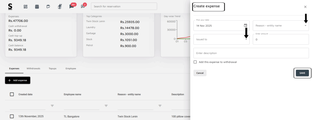 - Add a brief description of the expense for future reference (e.g., “Purchased cleaning liquid for Room 101”).