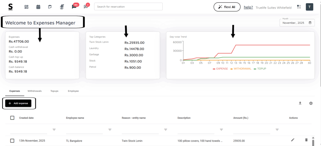 The Expense Manager in Stayflexi is an essential module for any property aiming to maintain financial discipline, improve expense accountability, and reduce manual errors. It’s more than just a tracker — it’s a smart financial tool built to support daily operations, internal audits, and long-term budgeting.