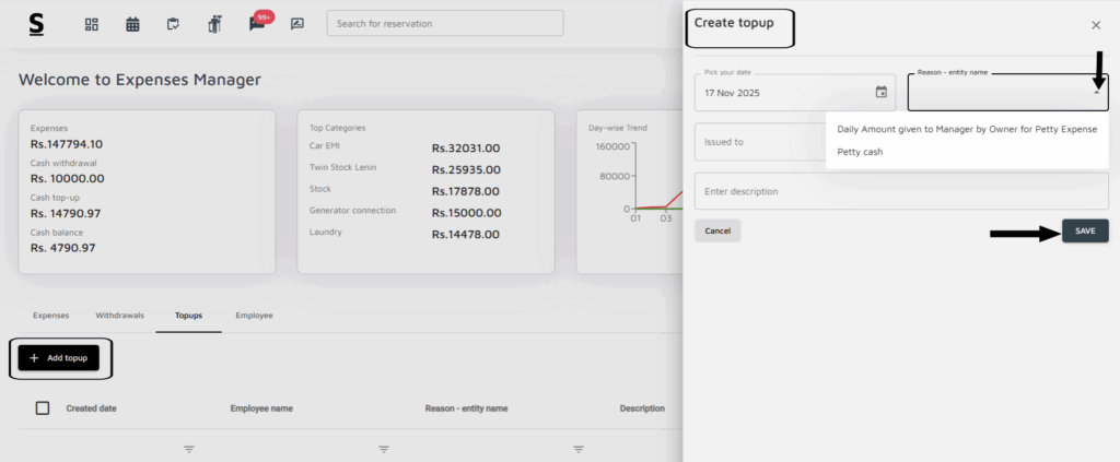 - Save the Top-Up:Click Save to log the entry. The system will update your overall cash balance accordingly.