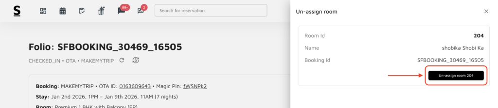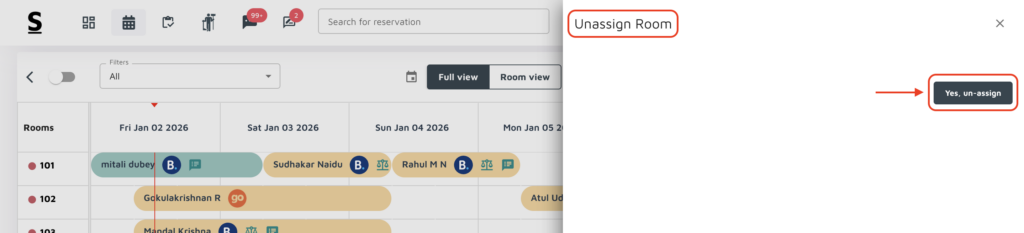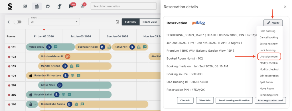 How to unassign a booking from a room number from the reservation calendar or room folio ?