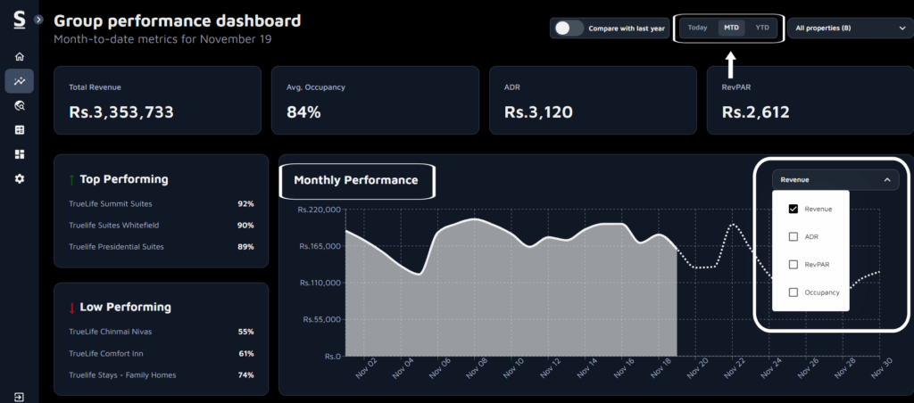 - Use the filter options above the graph to select the metric you want to analyse – Revenue, ADR, RevPAR, or Occupancy.