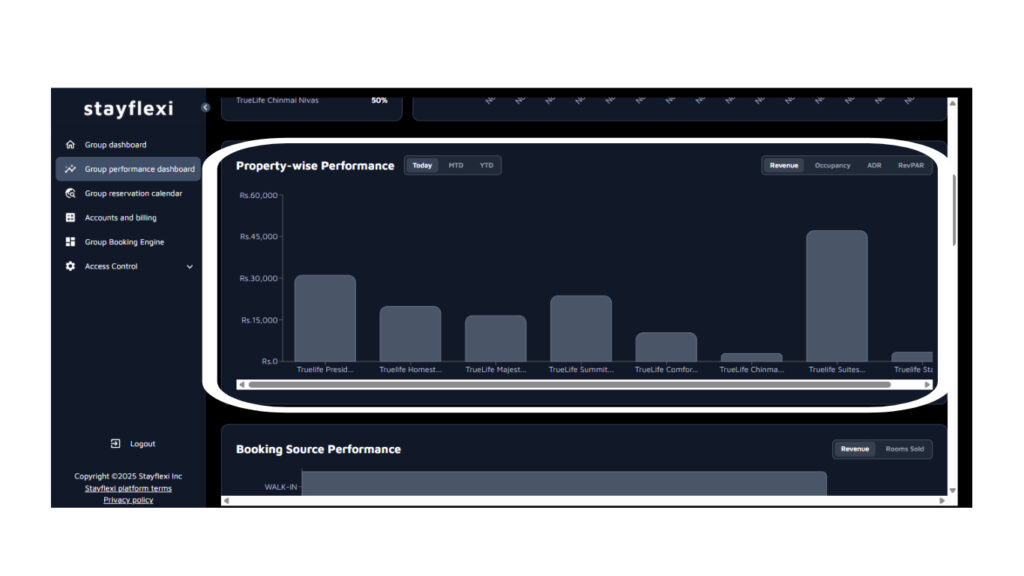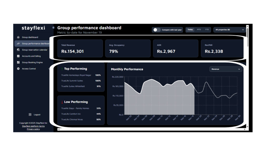 Under the Group Performance Dashboard in stayflexi, you can view and analyse the performance of your properties in detail: