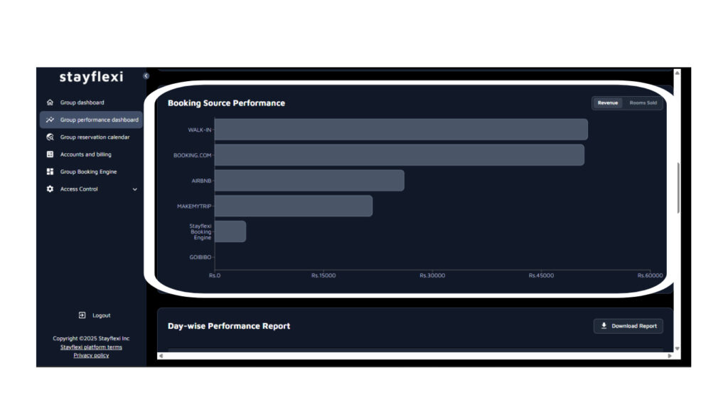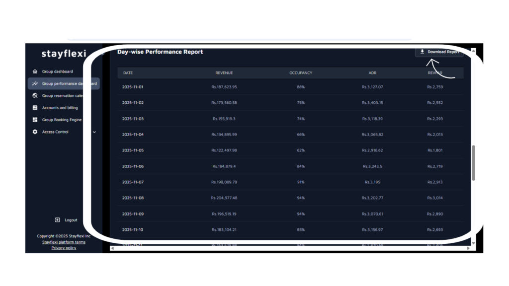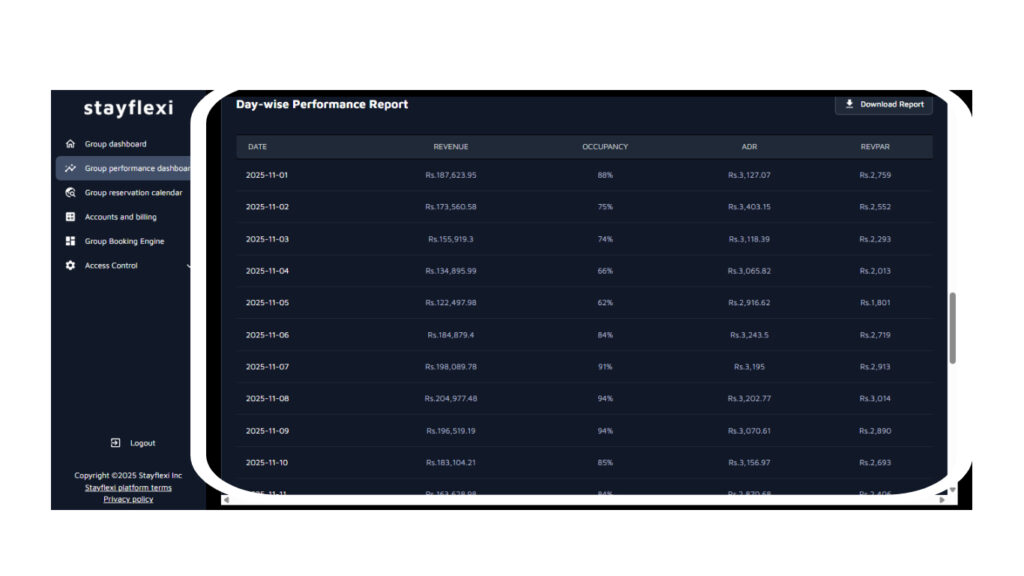 - Day-wise Performance Report: Access daily summaries of Revenue, ADR, Occupancy, and RevPAR, with the option to download reports for further analysis.