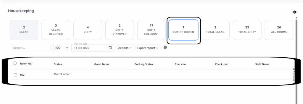 You can easily view and manage all Out-of-Order rooms directly from the Housekeeping module. The system provides both a quick visual overview and a detailed report for better tracking and maintenance management.