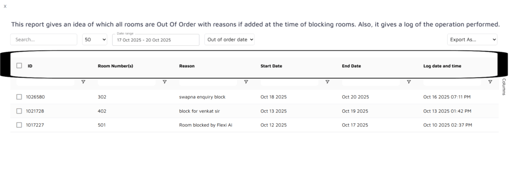 - This opens a detailed log of all rooms that are currently out of order, including: