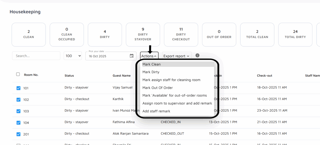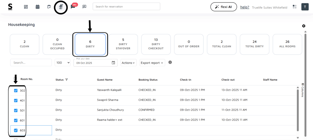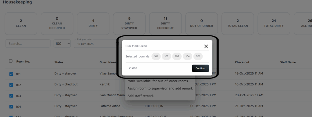 Yes, there is a simple and efficient way to mark all dirty rooms as clean directly from the Housekeeping interface, and it’s designed to be very user-friendly.