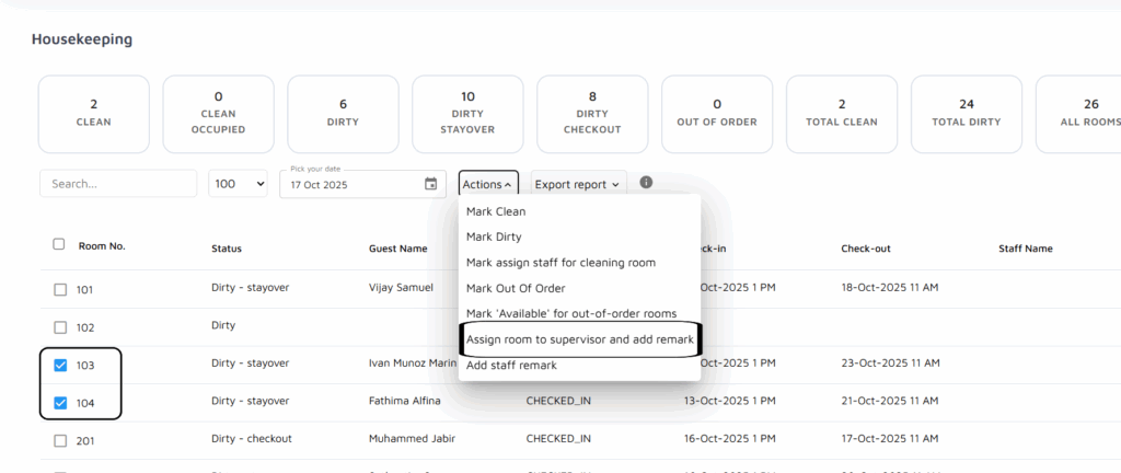 - Once rooms are selected, click on the Actions dropdown menu at the top of the Housekeeping Dashboard.