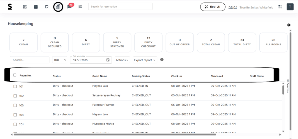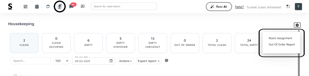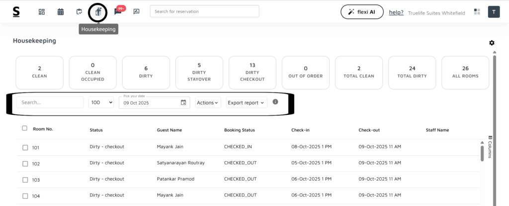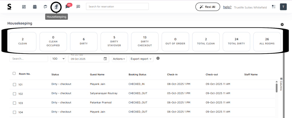 On the top menu, click the Housekeeping icon (4th icon from the left) to open the Housekeeping dashboard. This page displays all rooms along with their current housekeeping and booking statuses.