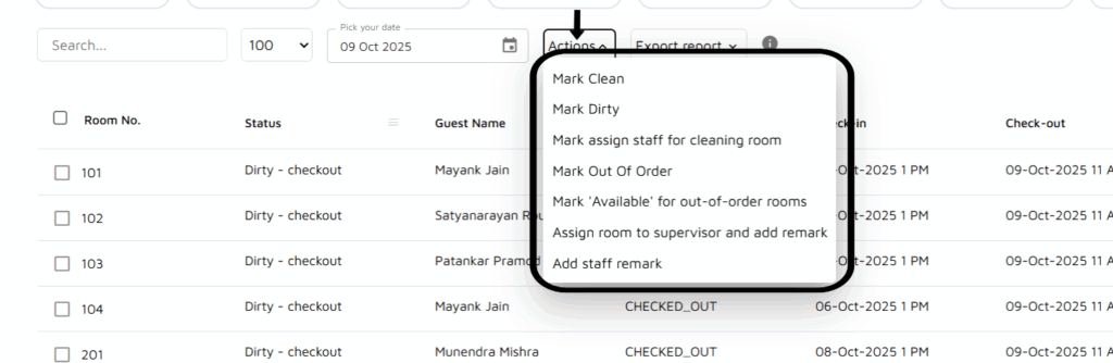 - Actions Dropdown: Provides key housekeeping operations such as: