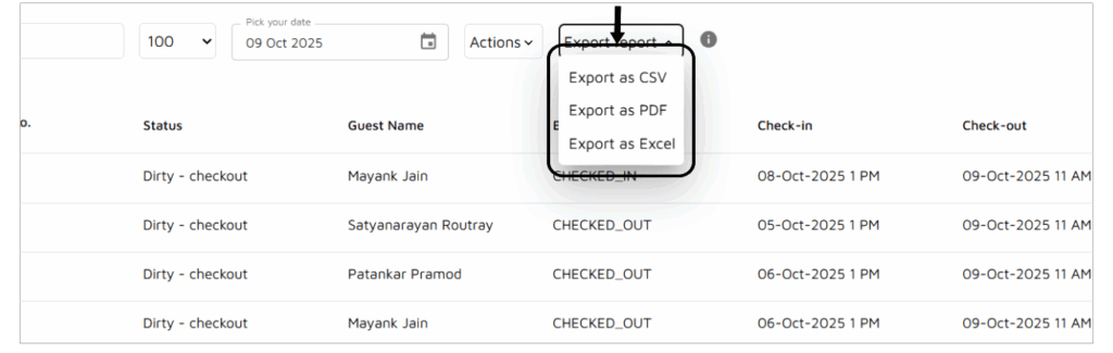 - Export Report Dropdown: Download detailed housekeeping activity reports in PDF, CSV, or Excel formats for easy tracking and management.