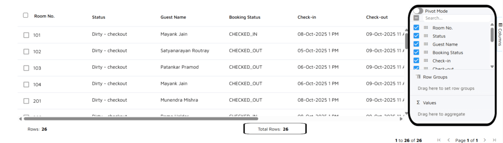 - Search Bar: Quickly search for a specific Room No., Guest Name, or Room Type.