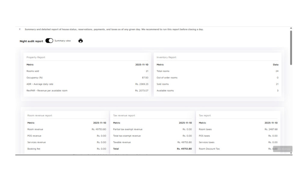 During the Night Audit in Stayflexi, various reports are generated based on your property’s configuration. These typically include: