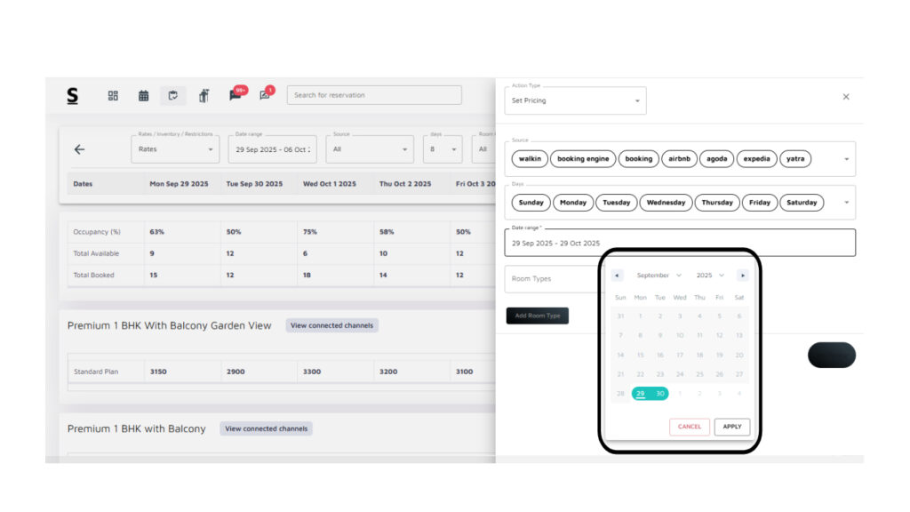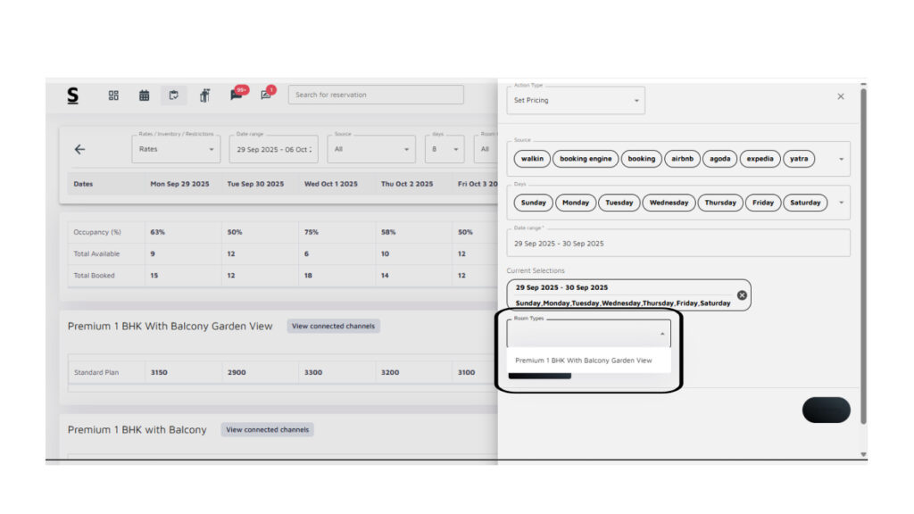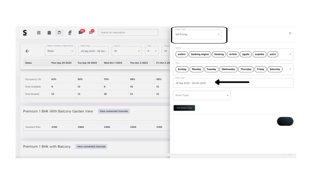 To change prices for Multiple Date Ranges and across Multiple Room Types, follow the below steps: