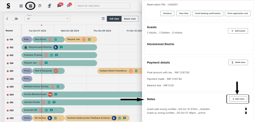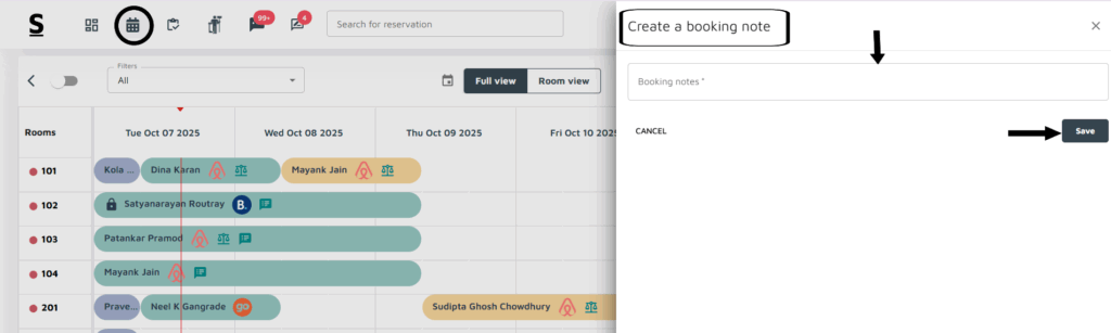 Confirmation: Your note will be added and saved. You can easily identify that the reservation has a note by the Message Icon appearing next to the reservation in the calendar.