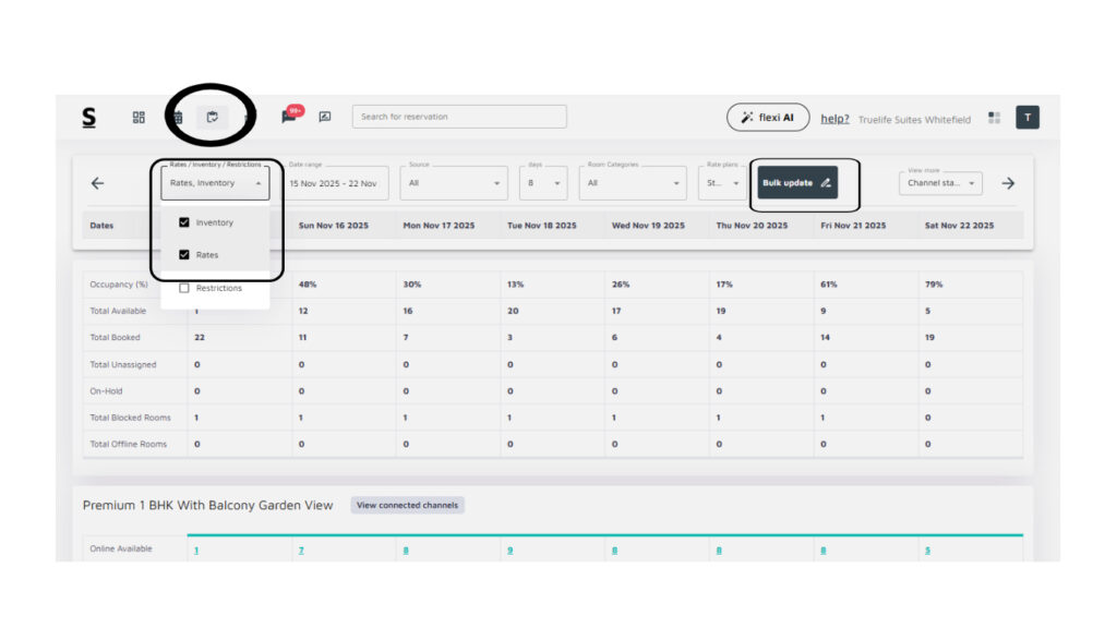 - In the Stayflexi dashboard, click on the Rates and Inventory icon (it’s the 3rd icon from the left in the top menu).